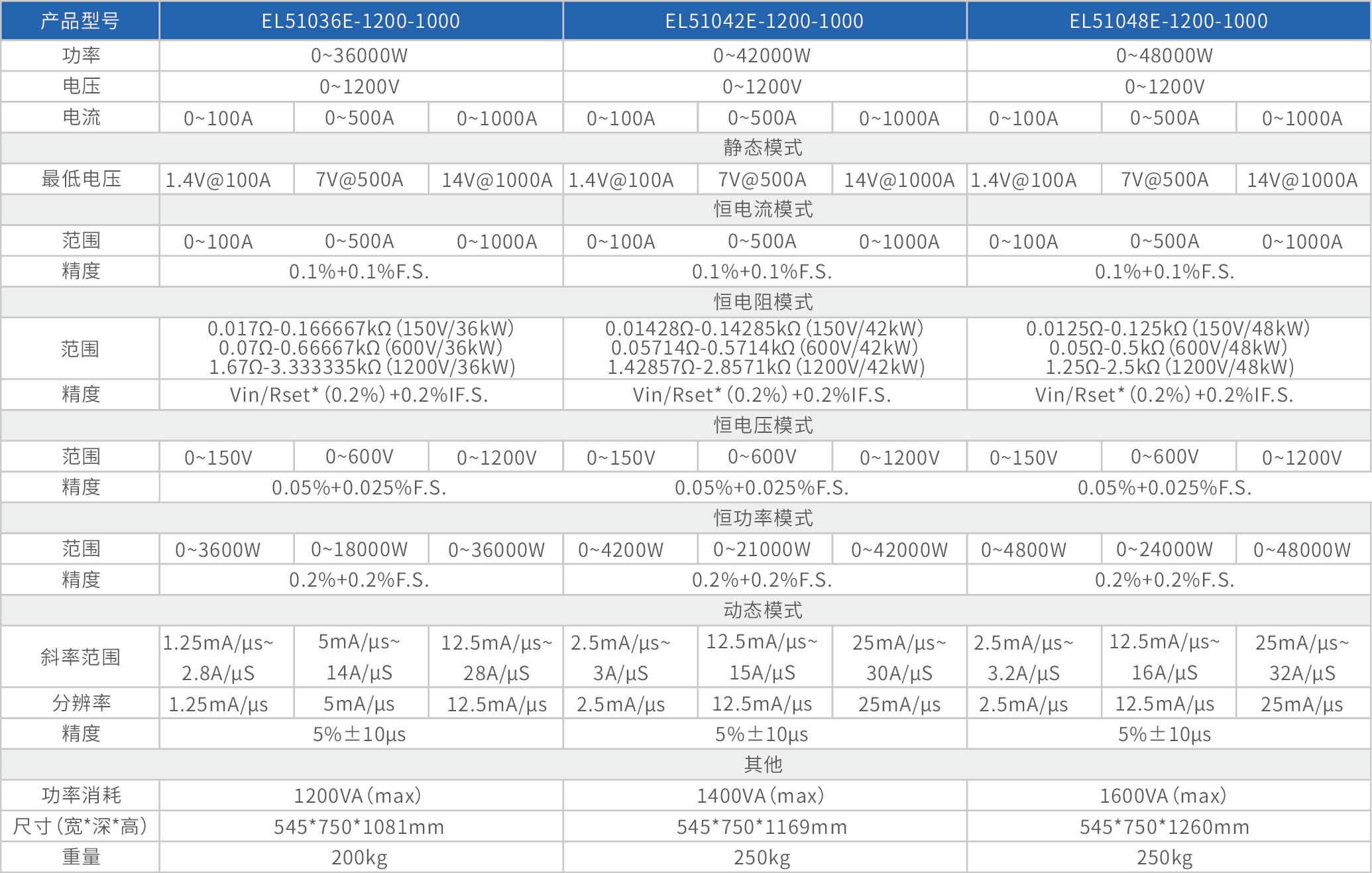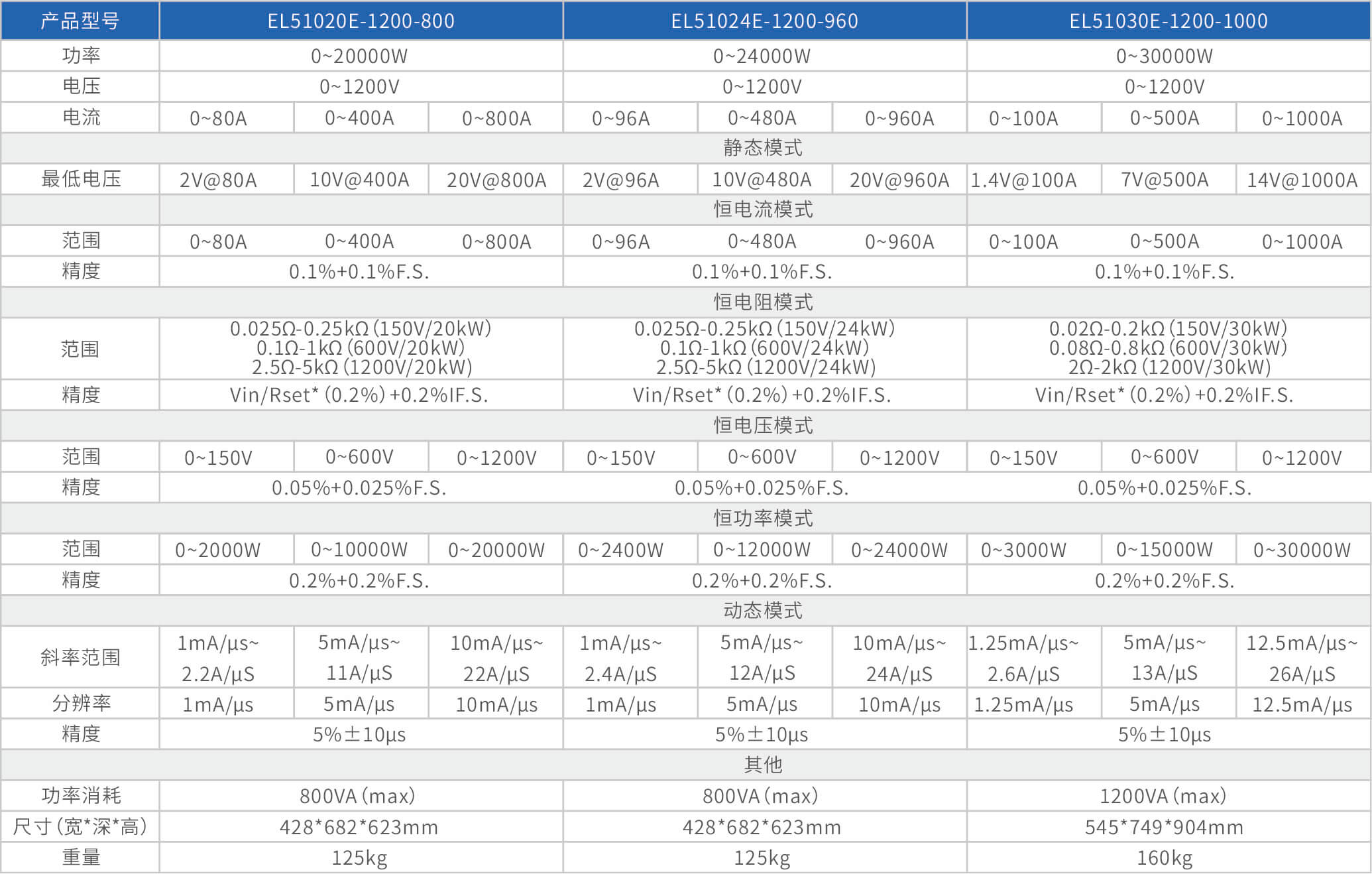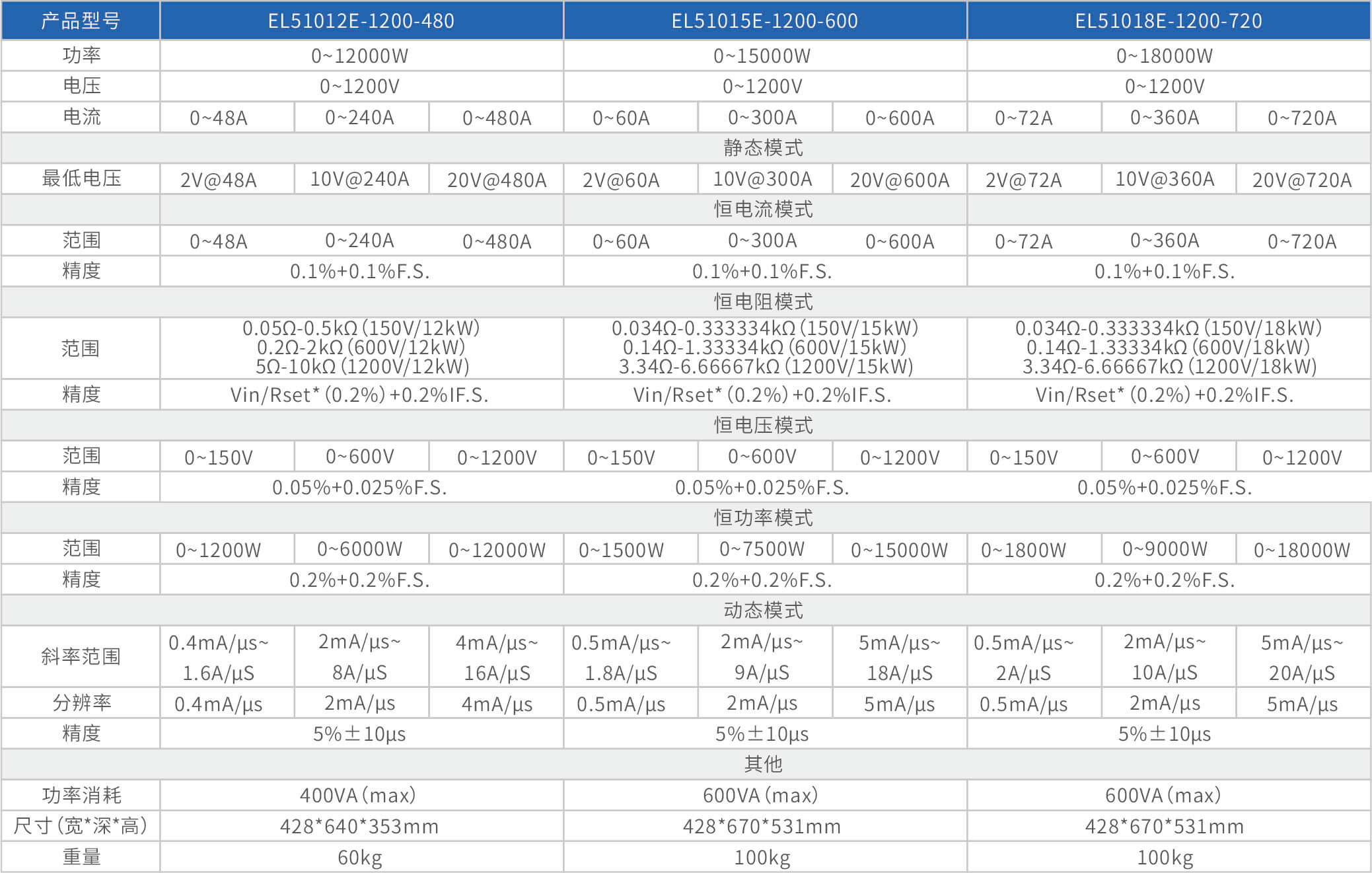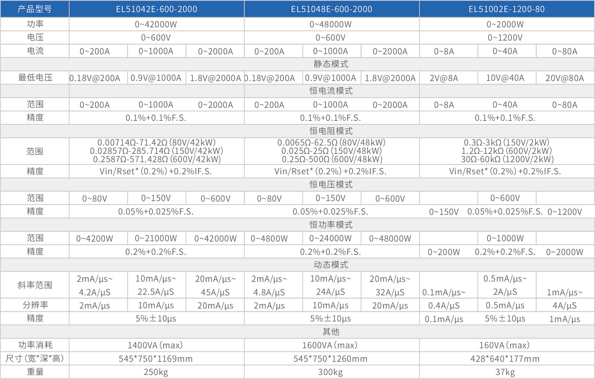 大功率電子負(fù)載EL51000E系列,有150V、600V、1200V三種電壓范圍,功率范圍由2kW至48kW,單一臺的最大電流可達(dá)2000A;通過并聯(lián)擴(kuò)展,最大功率更可達(dá)480kW。EL51000A系列負(fù)載具有高功率密度、高控制和測量精度、高性價(jià)的特點(diǎn);同時(shí)本系列負(fù)載具備同步動(dòng)態(tài),并聯(lián)擴(kuò)展等功能,以及瞬間提供三倍額定功率功能,支持恒電壓CV、恒電流CC、恒電阻CR、恒功率CP四種傳統(tǒng)靜態(tài)加載模式,以及CV+CC、CR+CC、CV+CR三種復(fù)合加載模式。