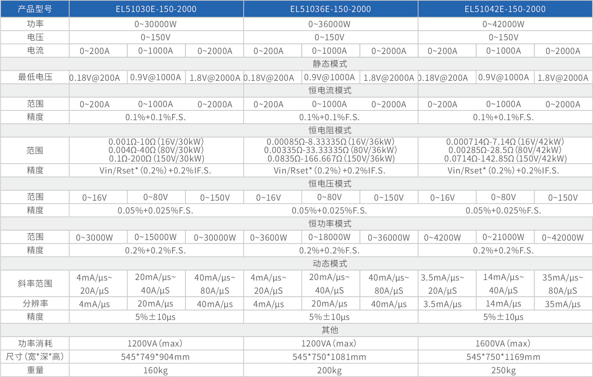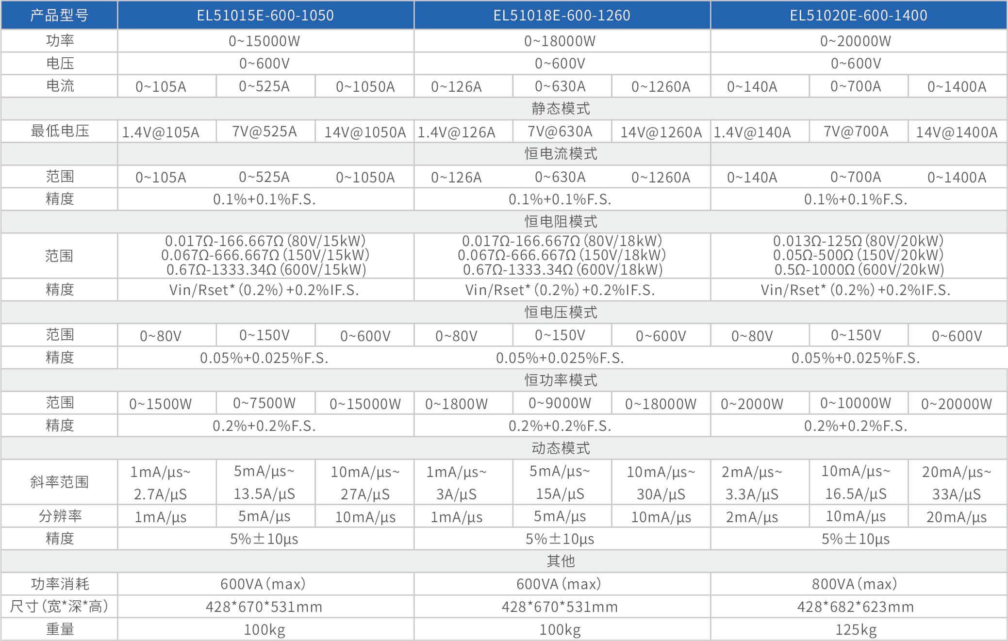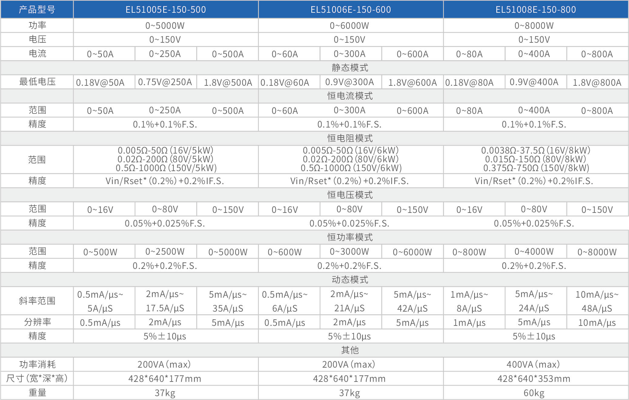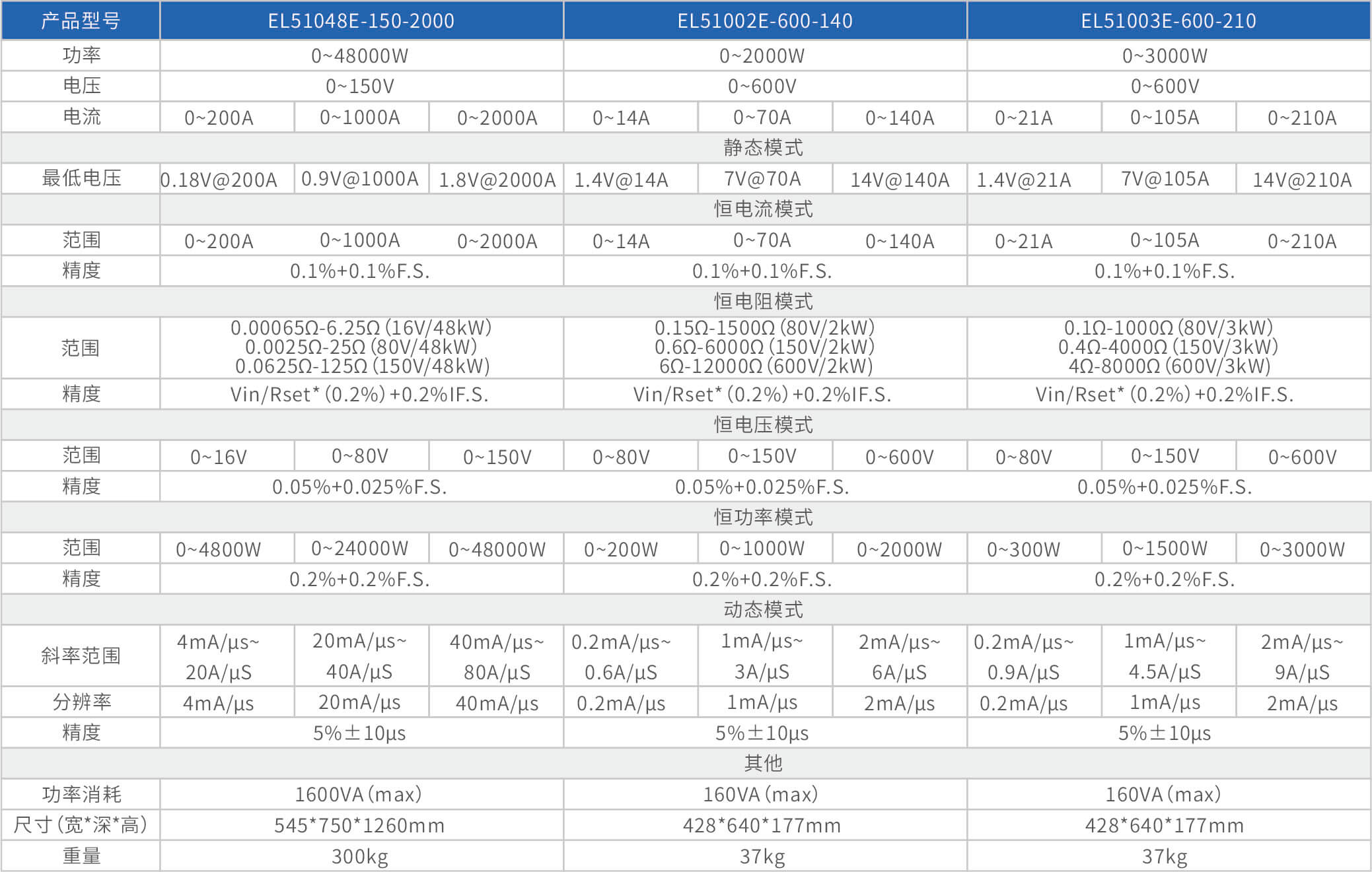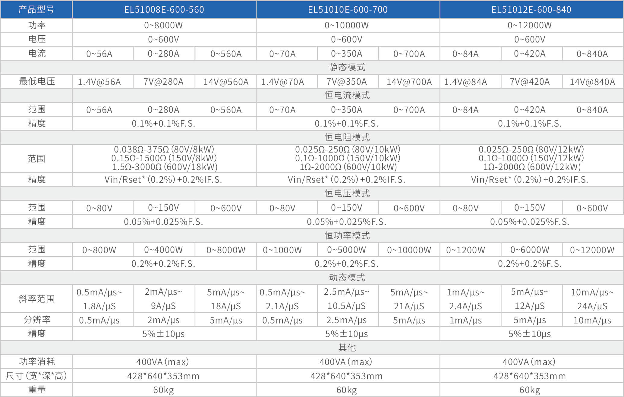 大功率電子負(fù)載EL51000E系列,有150V、600V、1200V三種電壓范圍,功率范圍由2kW至48kW,單一臺的最大電流可達(dá)2000A;通過并聯(lián)擴(kuò)展,最大功率更可達(dá)480kW。EL51000A系列負(fù)載具有高功率密度、高控制和測量精度、高性價(jià)的特點(diǎn);同時(shí)本系列負(fù)載具備同步動(dòng)態(tài),并聯(lián)擴(kuò)展等功能,以及瞬間提供三倍額定功率功能,支持恒電壓CV、恒電流CC、恒電阻CR、恒功率CP四種傳統(tǒng)靜態(tài)加載模式,以及CV+CC、CR+CC、CV+CR三種復(fù)合加載模式。